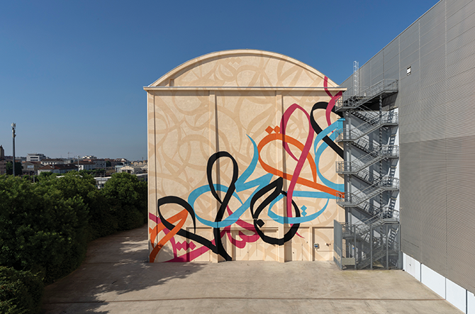 PHB 야외 공간에 있는 벽화. eL Seed, Waves Only Exist Because the Wind Blows, 2024. Courtesy eL Seed and Pirelli HangarBicocca, Milan, 2024 © 2024 eL Seed / SIAE Photo by Lorenzo Palmieri