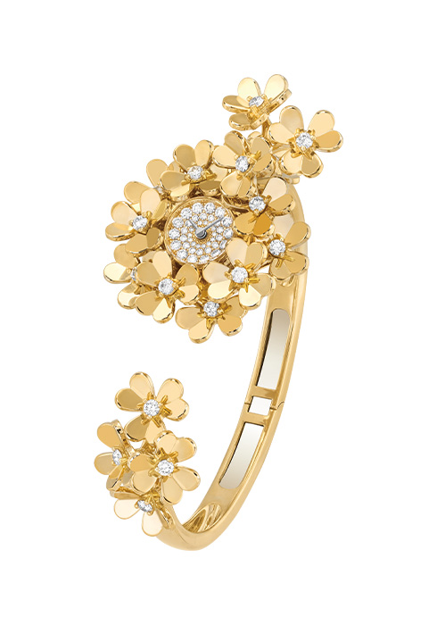 보는 재미와 착용하는 재미를 선사하는 반클리프 아펠의 장기,시크릿 워치를 소개한다. 따스한 봄이 온 것을 물씬 느끼게 해주는 비주얼로 메종의 장인들이 만발한 꽃에서 영감받아 한 땀 한 땀 정성스럽게 엮어 제작했다. 중앙의 네 송이 플라워가 열리면 시계로 변모하며, 다이얼에는 다이아몬드로 가득 채워 꽃술을 표현한 것이 인상적. 시계를 닫으면 훌륭한 하이 주얼리 피스 뱅글로 연출 가능하다. 18K 옐로 골드와 총 1.4캐럿 다이아몬드 62개를 세팅해 완성했다. 쿼츠 무브먼트로 작동한다. 문의 1877-4128