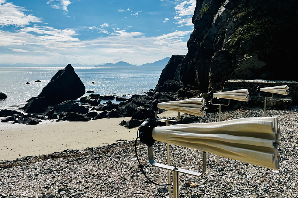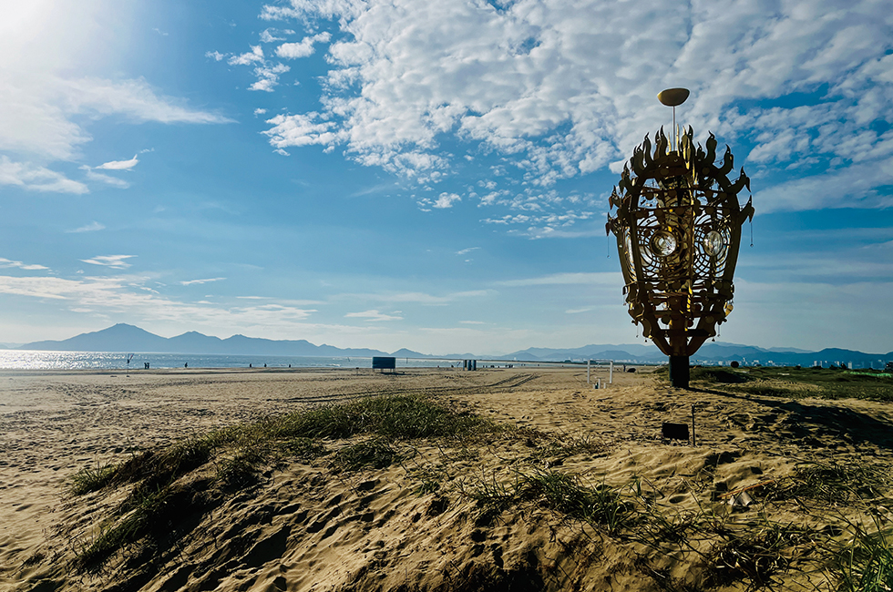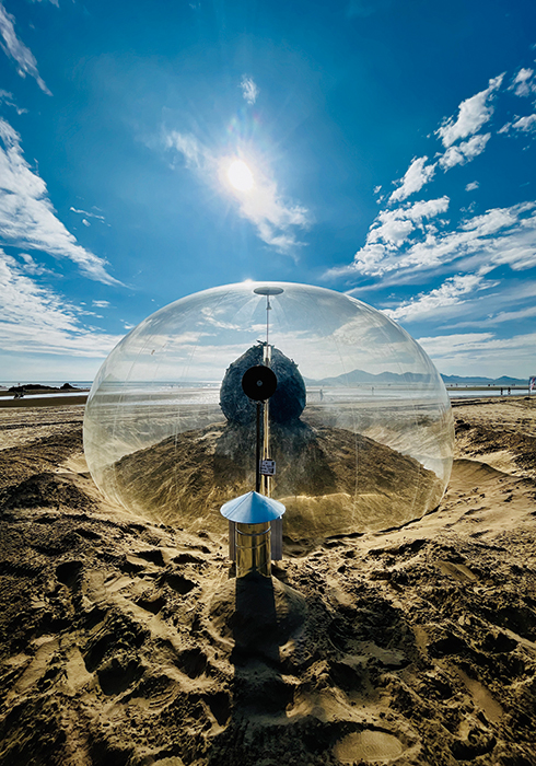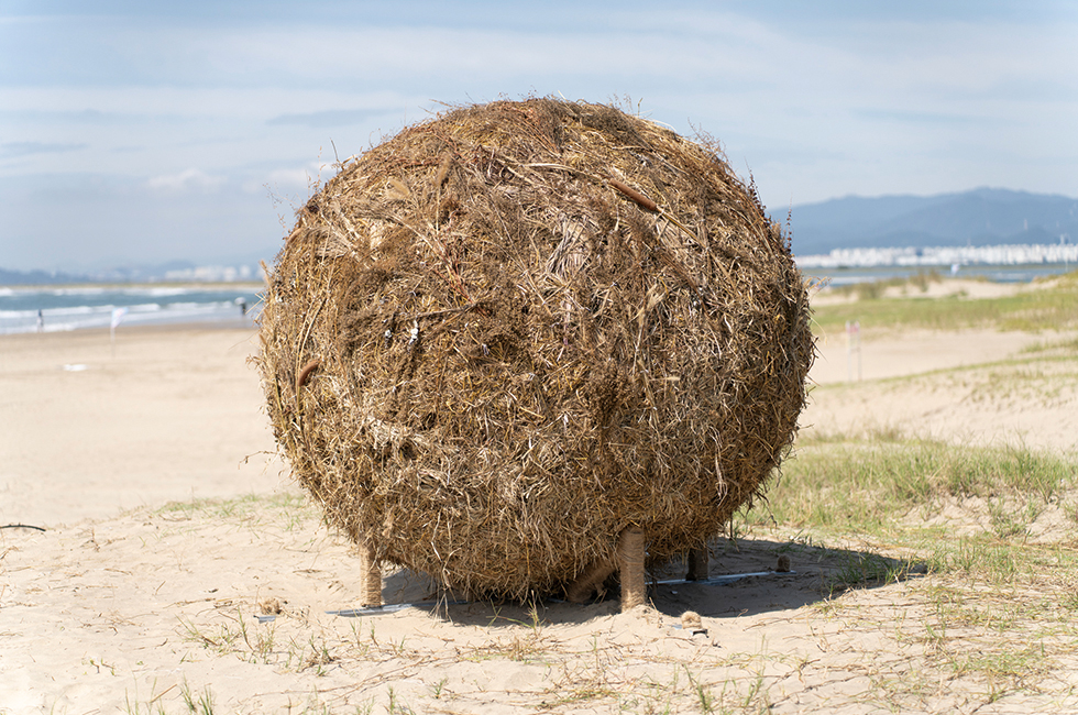 지역 주민이 함께 만든 대형 재활용 플라스틱 카펫 작품을 선보인 마티아스 케슬러와 아멧 치벨렉은 버려진 플라스틱에 주목했다. 이들은 다대포해수욕장을 중심으로 부산 전역에서 수거한 폐포장재와 플라스틱 쓰레기를 재료로 대형 카펫을 직접 손으로 엮었다. 쓰레기와 공예의 경계를 허문 작업 ‘아무것도 아닌 것에서 무언가를 만들기’는 바람이 불 때마다 파도처럼 일렁이며 생생한 패턴과 리듬을 만들어낸다. 다대포, 마요르카, 뉴욕의 해변에서 각각 수집한 모래 알갱이로 작품을 만든 지븨 리와 필립 C. 라이너의 작품은 마치 아테네의 어느 신전에 도착한 듯한 느낌을 준다. 베를린을 기반으로 활동하는 한국 태생 예술가 지븨 리와 건축가 출신의 독일 기하학 연구자 필립 C. 라이너는 오랜 시간의 흔적을 품고 있는 모래가 지구를 형성하는 보이지 않는 힘들의 아카이브라고 생각한다고. 다대포해수욕장의 바위에 놓인 해마를 닮은 조각 ‘마이 시스터즈’를 만든 독일 작가 하이케 카비슈의 작품도 환경 위기를 일깨운다. 경계에 있는 생명체인 해마처럼 바다 앞 바위에서 묵상 중인 이 조각은 마치 삶과 죽음, 바다와 땅의 경계를 지켜보고 있는 듯하다.