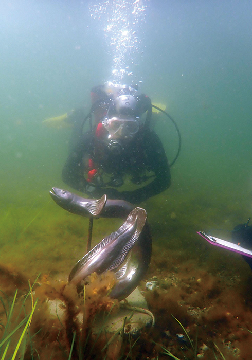 “저는 우리가 듣지 못했던 부산 바다의 소리 풍경을 채집했습니다. 다대포 인근 해양 보호구역인 나무섬에서 직접 채집한 바다 생물 소리부터 한국해양과학기술원이 제공한 해양 생물 수중 녹음까지 스피커에서 울려 퍼집니다. 다대포 어촌 공동체에서 전해 내려오는 노동요 ‘후리소리’가 교차하며 울려 퍼지죠.” 우리 귀에는 들리지 않는 바다의 소리로 치유와 회복을 조각하는 이탈리아 작가 마르코 바로티는 다대포 해변의 지형과 조개껍데기 등의 데이터를 기반으로 인공지능이 생성한 뿔 같은 형상을 한 자신의 스피커 조각 ‘표류하는 소리’에 대해 이렇게 설명했다. 스위스를 기반으로 활동하는 마리 그리스마도 생태계 현장 조사 방식을 바탕으로 작품을 제작하는데, ‘물과 물 사이의 초록’은 바다에 사는 식물성 플랑크톤을 묘사한 도자기 조각 작품이다. 수중 관람도 가능하다는 점(스노클링 세션)이 재미나다. 다양하고 풍부한 식물성 플랑크톤이 낙동강을 따라 흐르다 다대포 하구에서 해양 먹이사슬의 시작점이 된다는 것에서 영감받은 작가는 산호초 생태계 복원을 목표로 하는 스타트업 ‘rreefs’의 공동 창립자다.