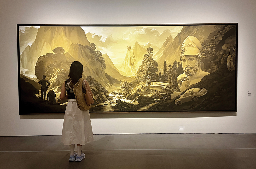 예컨대 전시장 첫 번째 방에 있는 조각 작품 ‘푸른색 방해석의 침식된 아를의 비너스(Blue Calcite Eroded Venus of Arles)’를 보자. 우아한 자태로 한 손에는 사과를, 다른 한 손에는 부서진 거울을 들고 있으며 부분적으로 파손된 흔적이 보이는 이 조각은 루브르 박물관 ‘아를의 비너스’를 원작으로 삼았는데, 발견된 당시에도 오른팔이 없었고, 왼팔도 일부만 남아 있었다고 한다. 최초에 어떤 모습이었는지는 누구도 모르기에, 다니엘 아샴은 2020년 파리 전시를 준비하면서 ‘3020년’에 발견된 조각상이라는 가상의 스토리를 더해 재해석을 시도했다. 폭 5m에 이르는 대형 회화인 ‘숭고한 계곡, 스투바이탈(Valley of the Sublime, Stubaital)’은 ‘모든 경계를 허문다’는 아샴의 세계관이 응집된 작품으로 자세히 들여다보면 오스트리아 티롤에 자리한 아름다운 계곡 스투바이탈의 웅장한 풍경을 배경으로 스타워즈의 ‘알투-디투’와 ‘쓰리피오’, 그리스 장군 페리클레스, 포르셰 911 터보 등이 등장한다. 서로 다른 시공간에 존재하는 유적지, 건축, 조각물을 결합하며 상상력을 자극하고 영원하지 않은 아름다움을 표현했다. 그가 미래에서 소환한 서울의 모습은 어떨까? 고고학적 발굴 현장을 재현한 ‘발굴 현장’이란 장소 특정적 작품을 통해 1천 년 뒤인 3024년 폐허가 된 서울의 모습을 상상했다. 휴대폰, 신발, 카메라 같은 현대적 물건이 마치 오래된 유물처럼 파손되고 풍화된 모습으로 드러나는 ‘발굴 현장’이다.