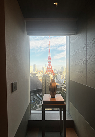 1 상대적으로 낮은 건물(13층)과 녹지가 조화를 이루는 자누 도쿄의 객실에서 보이는 도쿄 타워 모습. 대부분의 객실에는 도쿄 타워나 정원 풍경을 즐길 수 있는 전용 발코니가 있다. Photo by 고성연