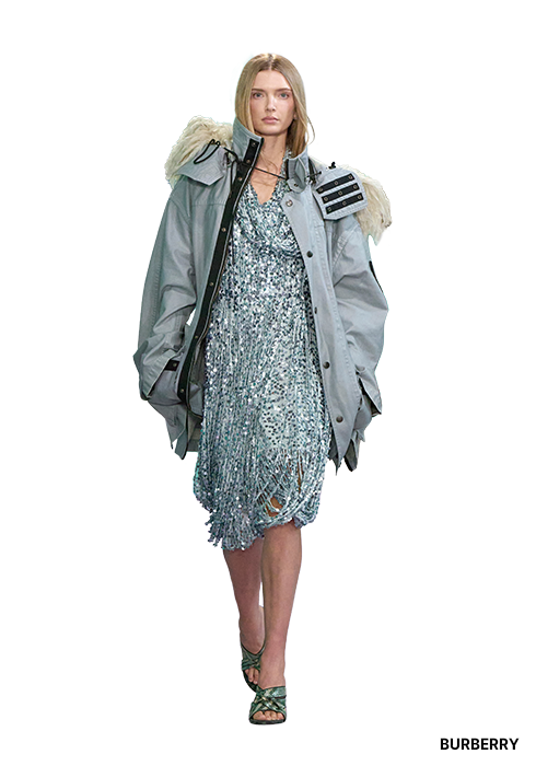 올 시즌 쇼는 유독 눈이 부셨다. 반짝이는 스팽글이나 시퀸 소재가 쇼 곳곳에서 등장했기 때문. 프라다는 아예 알루미늄이나 철을 사용한 듯 메탈릭한 느낌의 스커트를 선보이기도 했다. 이것은 AI, 가상현실 등 빠르게 변화하는 시대상을 반영한 미래 지향적 패션 트렌드라 볼 수 있다. 어쩌면 럭셔리와 컨템퍼러리 브랜드의 경계가 모호해져가는 현 패션 신에서 오랜 노하우와 장인 정신으로만 탄생할 수 있는 오트 쿠튀르적 의상을 선보이기 위한 노력일 수도 있을 듯하다. 특히 버버리에서 화려한 스팽글 드레스에 스포티한 점퍼를 매치한 것도 흥미로웠다. |