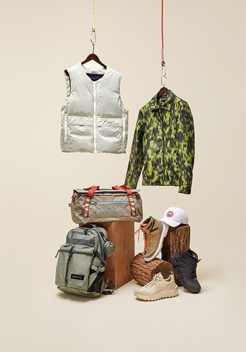 그래픽적으로 재해석한 카무플라주 프린트가 모던한 제롬 카모 재킷. 멤브레인을 적용한 발수 및 방수성 3레이어 스트레치 자카드 원단을 사용했다. 핏을 돋보이게 하는 엘라스틱 허리 밴드, 4개의 아웃 포켓과 2개의 이너 포켓을 더했다. 1백15만원 퓨잡. 문의 02-542-1546