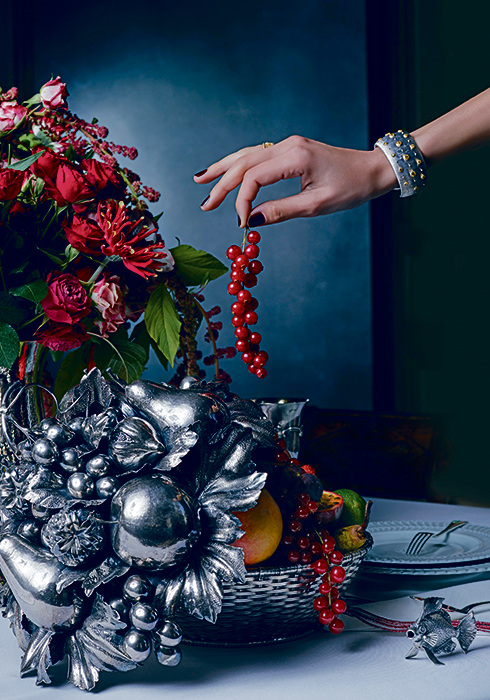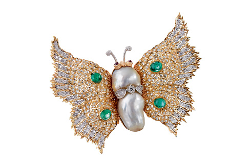 ‘자연을 살펴보라, 이것이 너의 미래일 것이니(Scruta la natura, e` il tuo future)’라는 레오나르도 다빈치(Leonardo da Vinci)의 선언은 달리 설명이 필요 없을 만큼 보편적인 아이디어다. 주얼리 제작 시 반복적으로 나타나는 경향성인 자연을 지향하는 디자인은 부첼라티의 시그너처다. 가지의 커팅과 세밀한 잎맥을 주얼리로 구현하기 위해 마리오가 나뭇잎을 얼마나 세심하게 관찰했을지는 상상만 할 뿐이다. 볼록한 골드를 바라보노라면 바람의 움직임에 대해 세심하게 연구했다는 사실을 느낄 수 있고, 오브제의 볼륨감이 이토록 생동감 넘치는 감각을 부여한다는 점을 발견할 수 있다. 카네이션, 베고니아, 작약, 제라늄, 양귀비, 아룸, 수선화, 클로버, 포도 잎까지, 시간이 지남에 따라 여러 세대에 걸쳐 레퍼토리가 점차 다양해지면서 하나의 진귀한 식물원을 이루게 된다. 이 같은 식물계는 마치 르네상스 거장의 준비 단계 스케치에서 막 끌어낸 것처럼 사실적으로 구현했다. 주얼리 및 실버웨어 같은 오브제는 자연 모형 그대로를 본뜬것처럼 보이며, 가장 아름답게 무르익은 그 순간에 멈춰 있는 듯하다. 다양한 테이블웨어 또한 새로운 매력을 선사한다. 물론 앤티크한 그릇 및 실버웨어 같은 전통적인 장식 작품도 존재하기는 하지만, 요리를 구현한 작품 자체가 함께 축제에 참여하면서 눈과 혀끝 모두에 즐거움을 선사하는 세공의 향연을 펼쳐 보인다. 커다란 센터피스는 과일로 가득 찬 바구니를 고스란히 재현하고, 손잡이 역할을 하는 덩굴은 실버를 직조해 완성된다. 그 속에 담긴 배와 석류를 보면 무심코 한입 베어 물고 싶어질 정도다. 소라, 문어, 랍스터, 가리비를 보면 마치 해왕성의 마차가 연회에 참석하려 바다에서 상륙한 듯한 느낌을 준다. 자연을 연구한다는 것은 그 화려함을 재해석하고 호기심 어린 아이디어를 시각적인 한계까지 끌어올리는 것을 의미한다. 네크리스에 정교하게 배열된 양식 진주와는 천양지차로, 굴은 때때로 일탈적인 형태로 등장해 이상하면서도 기이한 매력에 익숙지 않은 이들에게 놀라움을 선사한다. 이는 바로 모양이 일정하지 않고 울퉁불퉁하며 일그러진 모양으로 잘 알려진 ‘바로크 진주’다. 아이들이 구름의 윤곽을 묘사하면서 놀듯, 부첼라티는 이 같은 보물을 크게 확대하는 데 특화되어 있다. 따라서 자신의 형태를 강조하고, 스스로는 결코 생각지 못했던 매력을 이끌어내는 다양한 구성 속에서 존재감을 발산한다. 그리고 이는 잠자리, 판다, 토끼, 독수리, 뱀으로 거듭나거나 온통 나비로만 이루어진 컬렉션의 실마리가 되었다. 1938년 첫 번째 나비 컬렉션이 탄생한 이후로 부첼라티의 동물 라인업에는 3백 마리 이상의 나비가 합류한 만큼, 부첼라티는 주얼리 분야의 나비 연구가와 같다. “자연을 살펴보라, 이것이 너의 미래일 것이니”라는 격언은 전형적인 르네상스 시대의 아이디어지만, 4세대의 디자이너를 거쳐 부첼라티의 철학에도 굳건히 자리 잡았다. 그리고 자세히 들여다보면 이는 현대 세계와 관련성이 가장 큰 이야기이기도 하다.