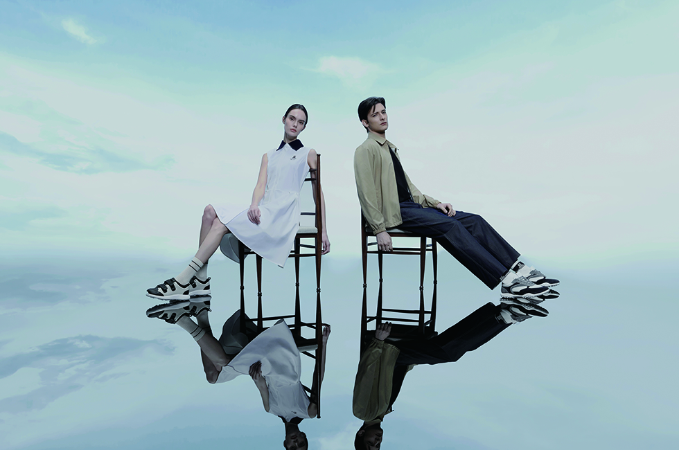 (여자 모델) 민소매 원피스 50만원대, 레더 벨크로 골프화 30만원대, 양말 3만원대, (남자 모델) 집업 점퍼 50만원대, 팬츠 40만원대, 레더 골프화 30만원대.