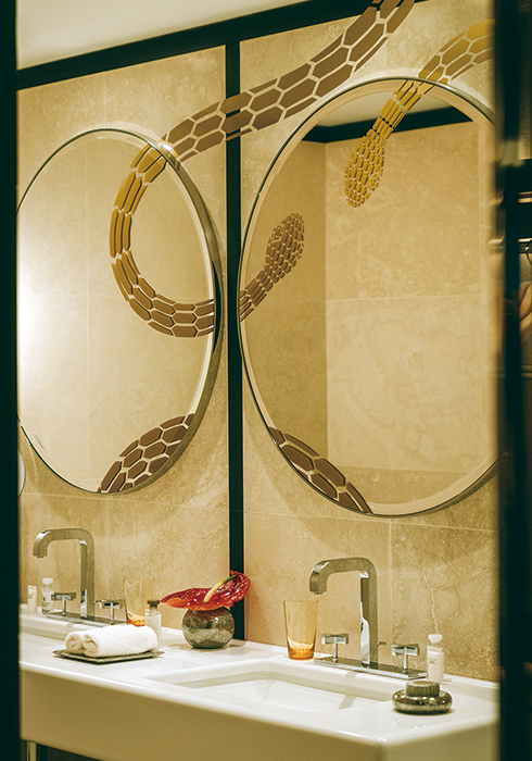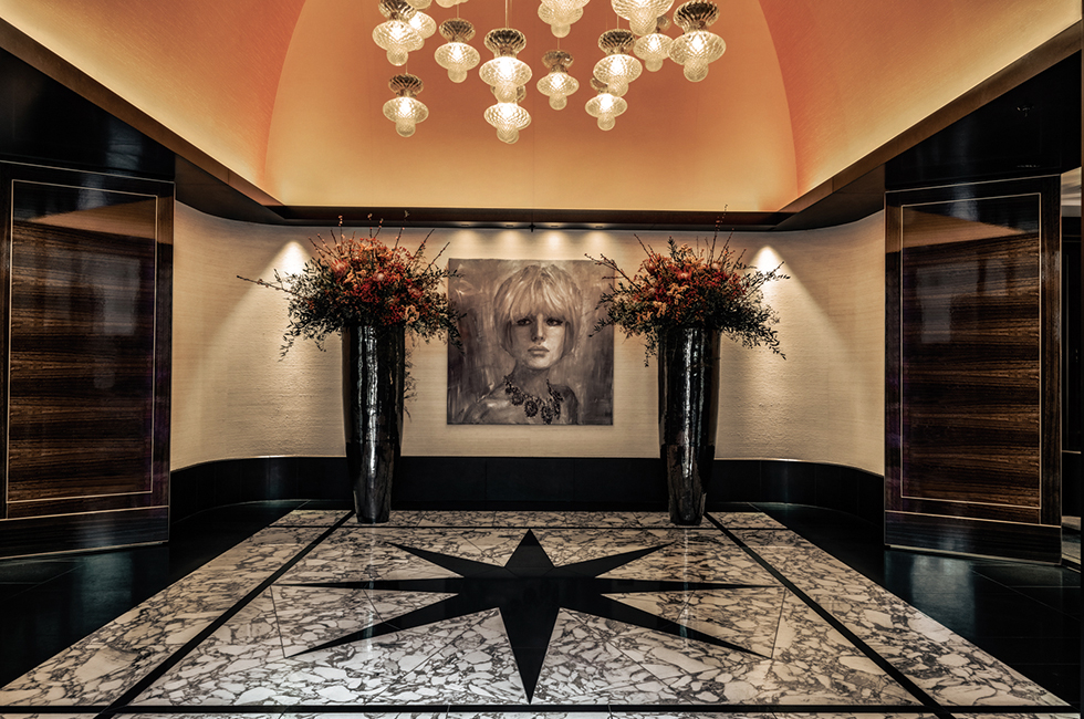 첫인상을 말하자면, 생각보다 편안하게 다가왔다. 온화한 베이지색 건물 안으로 들어서면 전반적으로 블랙 톤을 배경으로 감각적인 가구, 오브제와 더불어 1960년대 이 지역을 방문했던 소피아 로렌 같은 셀럽들의 사진으로 장식한 고혹적인 인테리어가 펼쳐지지만 ‘하이 주얼리 브랜드’라고 하면 곧잘 연상되는 특유의 화려함을 압도적으로 뽐내는 분위기보다는 은근하고 차분하게 매력을 발산하는 느낌이다. 자세히 뜯어보면 소품이나 조명 하나도 20세기를 수놓은 조 폰티(Gio Ponti)와 카를로 스카파(Carlo Scarpa) 같은 거장들의 혼이 담긴 작품이지만 말이다. 호텔 공간을 마주했을 때 시선을 절로 고정시키는 ‘잇 아이템’은 아무래도 로비의 은은한 실크 벽지를 배경으로 걸린 커다란 회화 작품이다. 묘한 눈빛을 한 여인의 초상화인데, 2022년 2월 2일에 별세한 이탈리아 배우 모니카 비티(Monica Vitti)를 그린 화가 얀페이밍(중국 출신으로 프랑스에서 활동한다)의 작업이다. 베니스국제영화제에서 황금사자상을 거머쥔(1964년) 영화 〈붉은 사막〉에서 보여준 강렬한 존재감이 아직도 생생해 “차오(ciao)”라고 인사를 건네야 할 것 같은 그림 속 그녀는 이탈리아의 경제적 황금기였던 1960년대를 반영하듯 큼지막한 불가리 목걸이를 차고 있다. 그녀의 초상 아래 깔려 있는 대리석 바닥은 르네상스의 걸작으로 일컬어지는 로마의 캄피돌리오 광장에서 영감받은 별 모양 패턴으로 수놓여 있다.