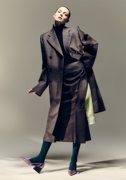 그레이 울 소재의 체크 코트, 블랙 슬리브리스 울 소재의 터틀넥 톱, 울 소재의 스커트, 피스타치오 컬러의 리넨 스커트, 새틴 컷아웃 펌프스 모두 가격 미정 프라다.