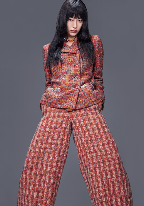 트위드 소재의 재킷, 울 트위드 소재의 팬츠, 메탈 & 글라스 펄 & 스트라스 초커 모두 가격 미정 샤넬.