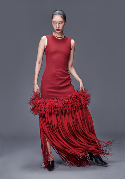 프린지 디테일을 더한 플루이드 비스코스 오간자 크레이프 소재 드레스 1천6백28만5천원, 루이스 펌프스 1백98만원, 골드 컬러의 네크리스 가격 미정 모두 보테가 베네타.