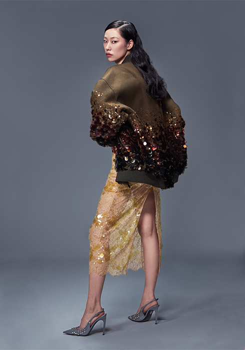 스팽글 장식의 보머 재킷, 플라워 레이스로 이루어진 이브닝드레스, 크리스털 체인 디테일의 그레이 페이턴트 슬링백 펌프스 모두 가격 미정 구찌. |