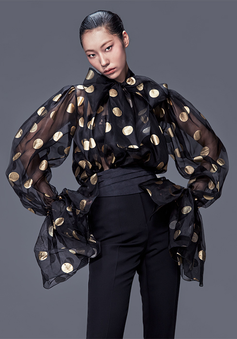 폴카 도트 패턴의 푸시 보타이 실크 오간자 자카드 블라우스 5백40만원, 울 개버딘 테일러드 턱시도 팬츠 1백86만원, 실크 새틴 커머번드 1백4만원 모두 돌체앤가바나.