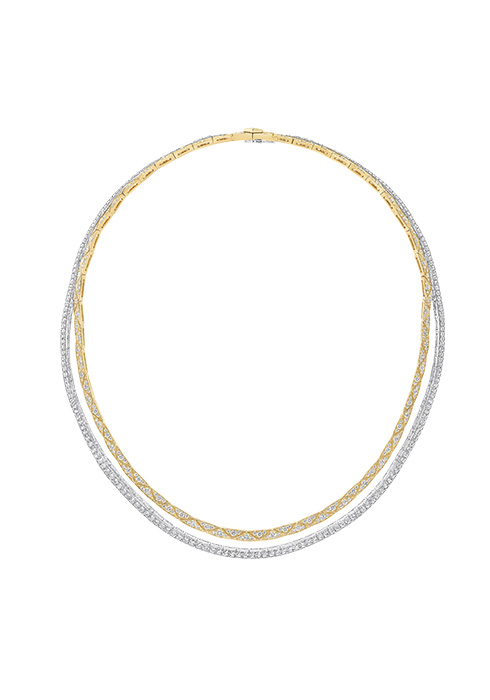 그라프 ‘로렌스 시그니처 컬렉션’은 하우스 최초로 성별에 관계없이 착용 가능하며 다양한 룩에 자유롭게 레이어링할 수 있는 유려한 디자인이 특징이다. 특히 네크리스는 진귀한 다이아몬드에 집중할 수 있도록 장식적인 디테일을 최대한 배제하고 모던하고 구조적인 실루엣을 강조했다. 데일리용을 원한다면 화이트 골드에 다이아몬드로 장식한 네크리스 또는 옐로 골드에 다이아몬드를 세팅한 네크리스를 추천한다. 색다른 룩을 원한다면 마치 2개의 네크리스를 레이어드한 듯한 디자인의 더블 네크리스가 제격이다. 옐로와 화이트 골드 각각에 다이아몬드를 촘촘히 파베 세팅해 화려한 멋도 느낄 수 있다. 가격 미정. 문의 02-2150-2320