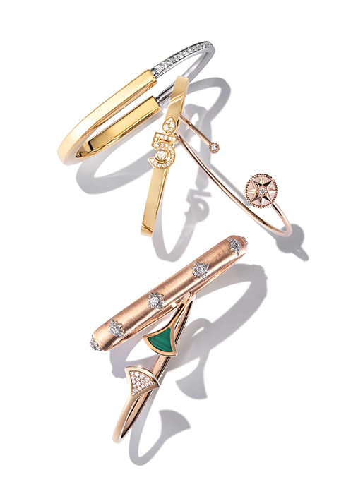 말라카이트 장식과 파베 세팅 다이아몬드로 표현한 부채 모티브 뱅글 1천2백20만원. 문의 02-6105-2120