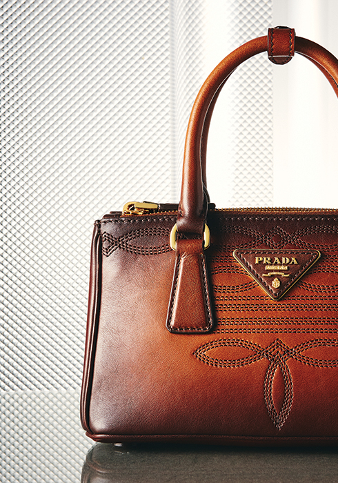 (왼쪽) 가방 전면에 수놓은 웨스턴 무드의 스티치와 그러데이션 워싱이 만나 색다른 분위기를 전하는 송아지가죽 소재의 갤러리아 미니 백 가격 미정 프라다. 문의 02-3442-1830