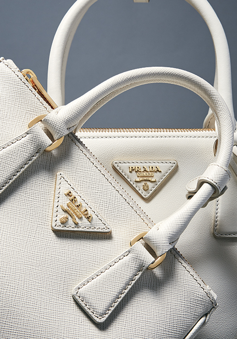(오른쪽) 송아지가죽에 불규칙한 빗살무늬 텍스처를 더해 내구성을 높인 갤러리아 사피아노 미니 백, 티없는 화이트 송아지가죽 소재에 브랜드 고유의 삼각형 로고를 더해 모던하게 완성한 갤러리아 미디엄 핸드백 모두 가격 미정 프라다. 문의 02-3442-1830