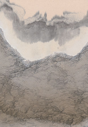 박예림의 회화에서 우리가 보는 것은 커다란 흐름이다. 역동적인 동시에 고요한 흐름이 화면에 담긴다. 솟아오르는 파도처럼 보이는 동시에, 바다가 밑에 펼쳐진 벼랑으로 보이기도 하고, 안개가 낀 산맥처럼 보이기도 한다. 어떤 사람은 나이테가 보이는 나무의 단면을 연상하거나(‘Wind Pattern’, 2023), 동굴의 벽면(‘Map’ 연작, 2023~24)을 연상할 수도 있다. 이런 상상을 살펴보면 정적인 것과 동적인 것, 그리고 고체와 액체 사이를 넘나드는 것을 알 수 있다. 질감이 두드러지는 동시에 퍼지고 확장하는 힘이 화면에 담긴다. 파도로 표현하는 바다에 대해 언급하는 <석도화론>을 참조 대상으로 삼은 것처럼, 동양화를 전공한 작가에게 아날로지(analogy)는 전통적 기법의 연장선에 있다. 이러한 이론적 토대 위에서 박예림은 모래의 가변적이고 중간적인 성격을 살리면서 회화 작업을 한다. 그렇다면 박예림에게 모래라는 재료는 무엇일까? 모래에 흐름을 만들어내는 대신, 전면을 같은 색으로 고르게 칠하고 덮는 방법도 있다. 그렇지만 박예림에게 중요한 점은 모래의 성격에 주목해 흐름을 창출하고 기억과 감각을 끄집어 오는 데 있다.