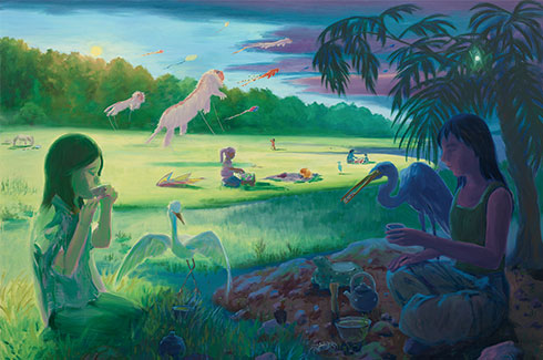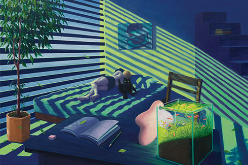 한강을 유영하는 아마존강돌고래, 낮과 밤이 동시에 공존하는 들판에서 차를 마시는 사람들, 꿈속에서 본 듯한 침실 풍경. 스페이스K 서울에서 열리는 최민영(Minyoung Choi, b. 1989) 개인전 <꿈을 빌려드립니다>는 현실과 비현실, 기억과 상상이 얽힌 몽환적 서사로 초대한다. 신작 회화 16점을 포함해 드로잉, 회화 등 30여 점을 선보이는 이번 전시는 공간 연출에도 세심하게 신경 썼다. 전시장 안쪽으로 들어갈수록 흰 벽이 점차 짙은 청록색으로 변하는데, 이는 시간의 흐름을 따라 구성된 3개의 공간을 거닐며 서서히 무의식의 세계로 향한다는 상징적 연출이다. 최민영은 일상적 풍경에 섬세한 상상의 결을 더해 독창적인 장면을 그려낸다. 전시 제목은 가브리엘 가르시아 마르케스의 단편소설에서 영감을 받았다. 이 소설의 핵심 기법인 마술적 사실주의는 현실의 틀에 비현실적 요소를 녹여내는 서사 방식으로, 최민영의 작업 방식과도 맞닿아 있다. 소설 속 꿈을 빌려주는 한 여자의 이야기처럼 그는 관객이 자신의 꿈 일부를 함께 경험할 수 있도록 가상의 세계를 직조해낸다. 런던을 기반으로 활동 중인 작가는 미국, 일본, 한국을 거치며 다양한 문화를 경험했고, 이 과정에서 감명받은 색채와 공간의 인상이 작품에도 자연스럽게 녹아들었다. 그는 “제가 사용하는 색은 단순히 눈앞의 현실을 옮기는 것이 아니라, 제가 느낀 감정과 기억을 기반으로 합니다”라고 설명한다. 작품 전반적으로 빛과 그림자의 대비가 돋보인다. 낮과 밤의 구분이 흐려진 초원을 그린 ‘해 달 차’, 블라인드의 줄무늬를 따라 비치는 빛이 공간을 감싼 ‘침실’ 같은 작품이 그 예다. 일상에서 포착한 빛의 순간들이 화면 속에서 마법처럼 어우러지며, 뚜렷한 명암 대비는 장면에 입체감을 더한다. 작품 속 동물들 또한 중요한 메타포 역할을 한다. 물고기, 불가사리, 올빼미 등은 현실과 꿈을 잇는 존재로 등장한다. 특히 4개의 캔버스를 이어 붙인 대표작 ‘밤 수영’에서는 고요한 밤바다를 배경으로 아마존에 서식하는 강돌고래가 등장해 신비로운 분위기를 자아낸다. 작가는 수면 위와 아래의 경계를 넘나드는 돌고래를 통해 서로 다른 두 세계가 자연스럽게 연결되도록 했다. “조금만 주의를 기울이면 우리 일상에서도 꿈같은 순간을 발견할 수 있다”고 말하는 그는 현실의 경험에서 영감받아 작업한다고 덧붙인다. 어린 시절 반려동물과의 교감, 한강 나들이와 해수욕장에서의 추억 등 친숙한 장면을 마주한 관객은 자신의 기억과 맞닿은 새로운 이야기를 떠올리게 된다.