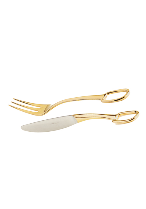 골드 도금 메탈 소재의 아뜰라주 컬렉션 디너 디저트 나이프 & 포크 가격 미정 에르메스. 문의 02-542-6622