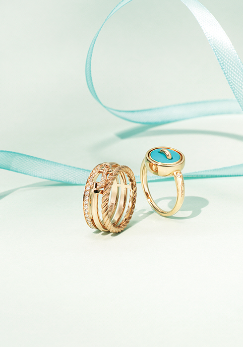 (왼쪽부터 차례대로) 브랜드의 시그너처 모티브 포스텐과 꼬임 디테일을 담은 디자인의 핑크 골드와 다이아몬드 소재 포스텐 라이즈 링 9백73만원 프레드. 02-514-3721. 초창기 브랜드의 아이코닉한 링 디자인에서 영감받은 스타일로 앞면에는 12개의 화이트 다이아몬드를, 뒷면에는 터쿼이즈 원석으로 장식해 다양하게 연출 가능한 로즈 골드 소재의 폼폼닷 리버시블 링 가격 미정 포멜라토. 0030-8321-0441. |