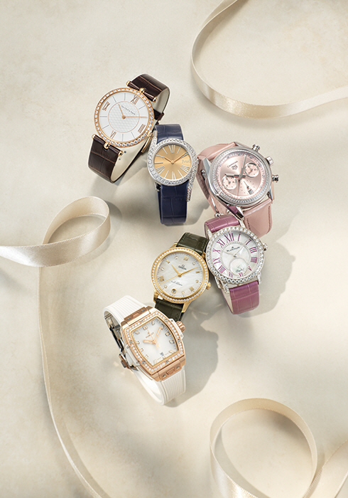화이트 자개 다이얼에 로마숫자와 다이아몬드 아워 마커를 교차 배열했으며, 코-액시얼 이스케이프먼트를 장착한 자동 와인딩 무브먼트로 구동하는 드 빌 프레스티지 3천2백만원대 오메가. 02-3467-8632.