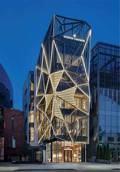 1 메종 1755 서울 외관. 심장과도 같은 말테 크로스 모티브와 아름다운 황금빛 브라스 소재 파사드로 장식, 웅장함을 더했다.