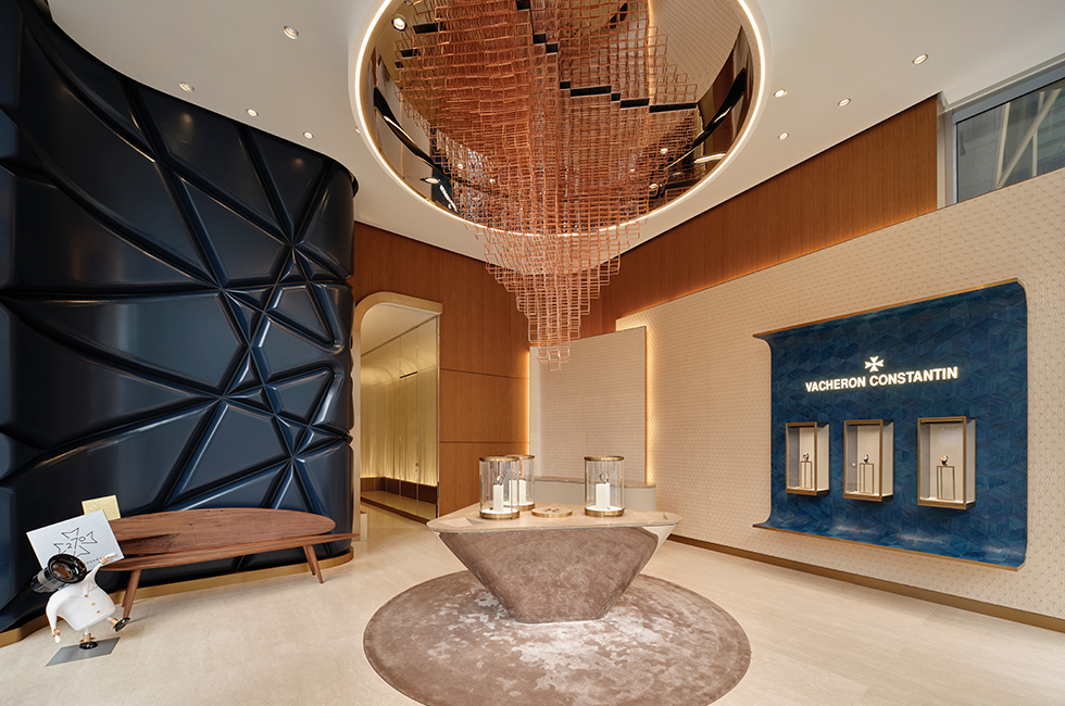 건물 외관은 바쉐론 콘스탄틴의 심벌인 말테 크로스(Maltese Cross)를 중심에 둔 황금빛 브라스 소재의 파사드로 장식해 메종의 상징성을 반영했으며 웅장함을 자랑한다. 내부에 들어서면 이 파사드가 더욱 빛을 발하는데, 기하학적 라인을 통해 들어오는 자연 채광을 극대화해 따뜻하고 고급스러운 분위기를 느낄 수 있다. 공간에 들어서자마자 외관과 연결성을 강조하는 3개의 대규모 설치 조각 작품이 가장 먼저 눈에 들어오는데, 이는 오프닝 전시를 기획한 아티스트 ‘지니서(Jinnie Seo)’의 새로운 작품이다. ‘Constellation of Lights’, ‘Blue Cloud’, ‘White Cascade’ 등 서로 연결된 3개의 대규모 설치 조각 작품은 구리, 유리, 백자 등 현대적이면서도 한국적이고 전통적인 소재로 완성해 공간에 강렬한 인상을 준다. 벽은 한국 전통 자수에서 볼 수 있는 패턴을 현대적으로 재해석하여 국가무형유산 제80호 자수 장인 김영이와 제자들이 손바느질로 완성한 ‘시간의 입방체: THREADS OF LEGACY’로 꾸며 고급스러움을 더한다. 이외에도 바쉐론 콘스탄틴은 인테리어 곳곳에 국내 예술가들의 아름다운 작품을 배치해 메종 1755 서울에 한국의 유산을 녹여내고자 했다. 메종이 고심해 마련한 이 한국적인 요소들은 바쉐론 콘스탄틴이 얼마나 한국에 대해 진심인지 확인할 수 있는 부분이다.