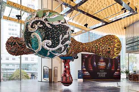 13 복합 비즈니스 빌딩인 타이쿠 플레이스에 있는 ‘아티스트리(ArtisTree)’에서 진행 중인 포르투갈 출신의 예술가 조아나 바스콘셀루스(Joana Vasconcelos) 전시 <Enchanted Forest> 설치 풍경. 호텔, 유통, 건설 등의 다양한 사업 분야를 거느린 스와이어 그룹(Swire Properties)에서 후원하는 아트 프로젝트다. 이와 더불러 공공 미술 컬렉션으로 영국의 조각 거장 앤터니 곰리(Antony Gormley)의 ‘SHELF II’를 타이쿠 플레이스의 야외 광장에 선보이기도 했다. 이미지 제공_Swire Properties
