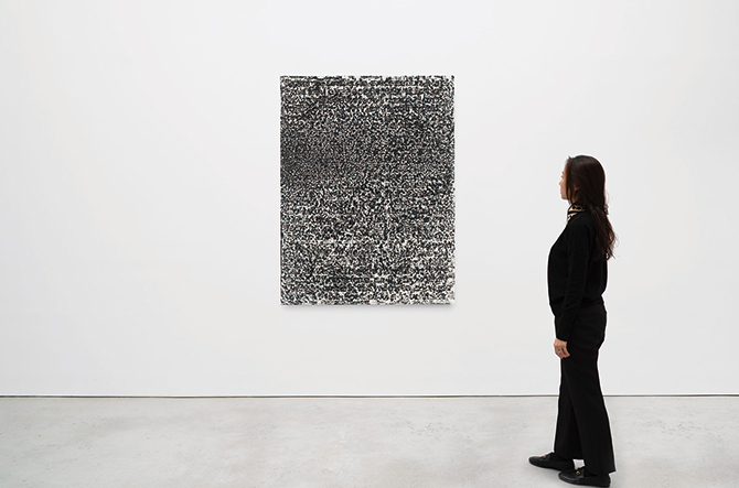 8 올초 H 퀸즈에서 가까운 지상층 갤러리 공간으로 옮긴 하우저앤워스의 글렌 라이곤(Glenn Ligon) 전시 모습. 텍스트를 기반으로 하는 회화 작업으로 널리 알려진 미국의 개념적 미술가 글렌 라이곤의 신작을 중화권에서 열리는 첫 번째 개인전에서 선보였는데, 모두 제임스 볼드윈이 인종 문제에 관해 쓴 기념비적 에세이 ‘Stranger in the Village’(1953)에서 발췌한 내용을 활용했다고. 오는 5월 11일까지. Static #8, 2023, Oil stick, coal dust and gesso on canvas 170.2 × 129.5cm. Photo_Ronald Amstutz