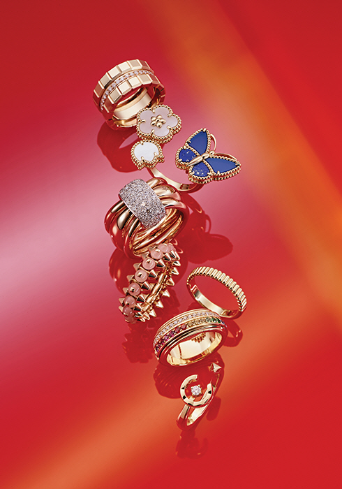 중앙 밴드가 회전하는 디자인으로 영원한 사랑을 상징하는 대표 주얼리 컬렉션. 기존 18K 로즈 골드 디자인에 다이아몬드뿐 아니라 각종 컬러 사파이어와 그린 차보라이트, 핑크 루비 등으로 유니크함을 부여했다. 2천3백20만원. 문의 1877-4275