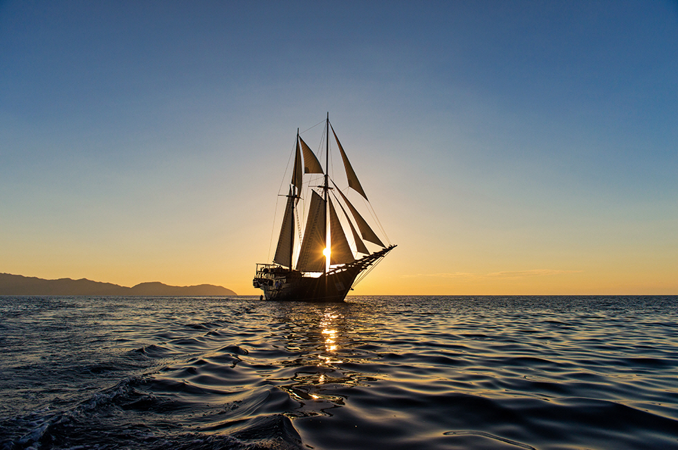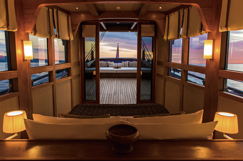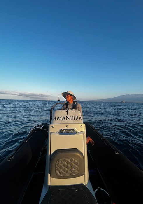 아만디라는 최소 3박 이상의 전세 서비스로 한 번에 한 팀(최대 10명)만 예약 가능한 프라이빗 요트 호텔이다. 물론 크루즈나 세일링을 즐기는 이들에게 3박은 짧지만, 그마저도 바쁜 일상에서 힘들게 짬을 내야 하는 이들이 인도네시아의 군도 절경을 바다 위에서 즐길 수 있는 축복 같은 항해 노선을 소화하려면 그 정도는 필수적인 일정이고, 대개 닷새는 가뿐히 넘게 소요된다. 엄연히 체크인-아웃을 하는 ‘호텔’다운 쾌적한 숙박을 염두에 두고 서서히(항속 4~8노트) 움직이기도 하거니와 블록버스터 영화에나 나올 법한 ‘코모도 드래곤(지구상에서 살아 있는 가장 큰 도마뱀으로 불린다)’이 서식하는 코모도섬, 스파이스 제도 등 항해 노선 자체가 범상치 않기도 하다. 아만디라의 크루즈 디렉터인 스티븐은 “대개는 6노트 정도로 느리게 항해한다”며 “손님들의 면면도 흥미롭지만 이 배에 탑승한 크루도 최고의 전문가들”이라고 강조했다. 항해사는 물론 다이버, 셰프, 테라피스트 등 14~15명의 분야별 전문 크루는 오로지 ‘나’를 위해 존재한다. 심지어 커피도 식사도 ‘아만디라가 최고’라며 엄지 척을 하는 손님들이 많을 정도다. 하지만 그 매혹적인 미식도 갑자기 돌고래 몇 쌍이 등장했다는 소식에 뒷전으로 밀렸다. 일출과 함께 지구상에서 가장 큰 물고기라는 고래상어를 보고 난 뒤 아침 식사로 한숨이 나올 정도로 맛난 부부르 아얌(‘닭죽’)을 즐기던 중에 “돌고래가 나타났다”는 크루의 외침에 다들 포크를 놓고 갑판 위쪽으로 달려갔다. 그리고는 한동안 하염없이 돌고래의 춤만 바라봤다.