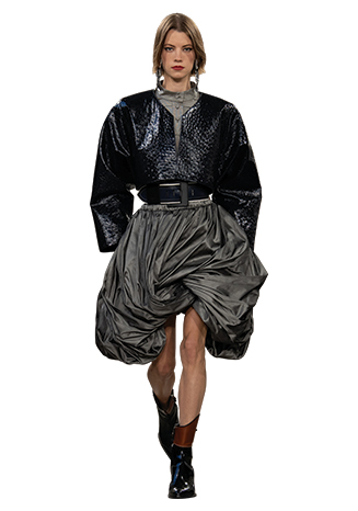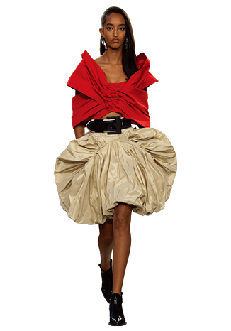 4 풍성한 볼륨의 드레이프 블라우스와 버블 스커트.