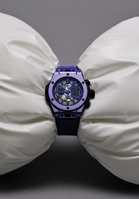 위블로만의 비비드한 블루 세라믹으로 완성한 ‘빅뱅 유니코 블루 매직’. 지름 42mm 케이스에 오픈워크 다이얼로 스포티함을 강조했으며 HUB1280 셀프 와인딩 무브먼트로 작동한다. 3천만원대 위블로. 문의 02-540-1356 |
