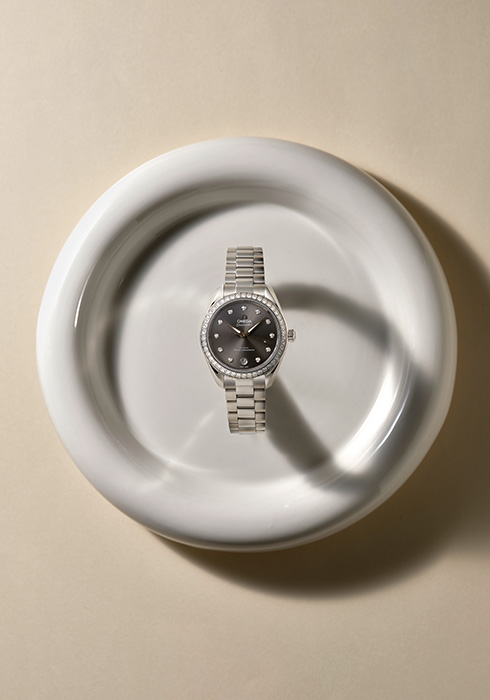 브랜드를 대표하는 클래식한 디자인의 씨마스터 아쿠아 테라 150M. 지름 30mm 케이스에 오묘한 그러데이션 효과를 준 그레이 다이얼을 매치하고, 베젤과 인덱스에는 다이아몬드를 세팅해 세련되고 우아한 느낌을 준다. 1천8백만원대 오메가. 문의 02-6905-3301