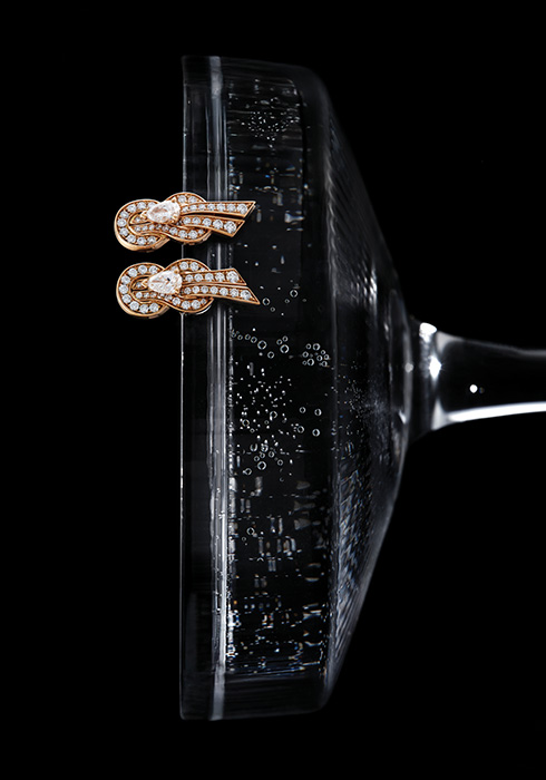 운명의 매듭을 상징하는 리본에서 영감받은 아이코닉한 샹스 인피니 컬렉션의 새로운 이어링. 18K 핑크 골드 소재에 다이아몬드를 풀 파베 세팅하고 중앙에 페어 컷 다이아몬드를 세팅해 찬란한 광채와 우아함을 선사한다. 1천9백10만원 프레드. 문의 02-514-3721