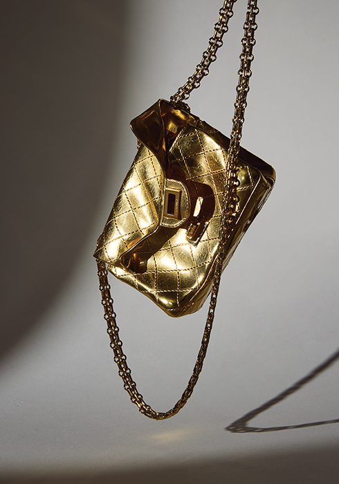 가방을 이루는 모든 요소를 골드빛으로 통일해 주얼리 못지않은 영롱함을 선사하는 독특한 셰이프의 스몰 이브닝 백. 11×12.5×5cm, 가격 미정 샤넬. 문의 080-805-9628