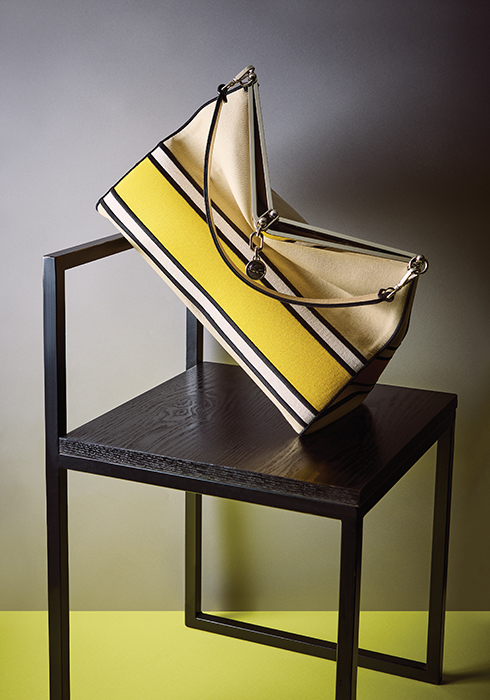 옐로 컬러 블로킹을 가미한 건축적 디자인의 캔버스 소재 벨라 백. 42×30×20cm, 가격 미정 에트로. 문의 1899-2939