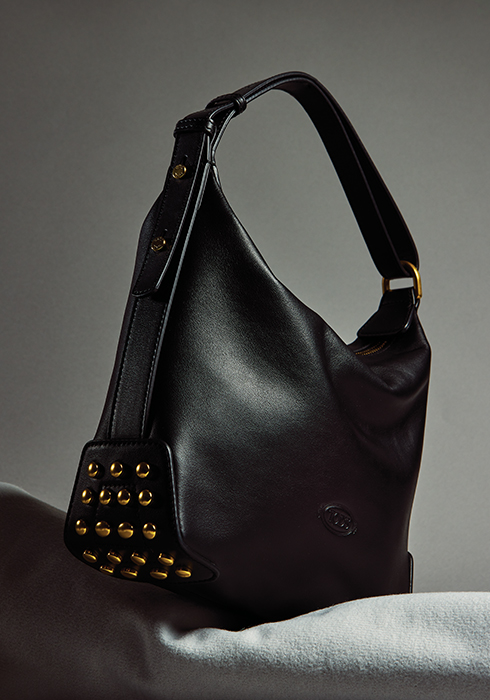 신발의 밑창 모티브를 활용했다. 독특한 메탈 엠보싱 디테일을 적용한 카프 스킨 메탈 도트백. 21×24×8cm, 2백17만원 토즈. 문의 02-3438-6008