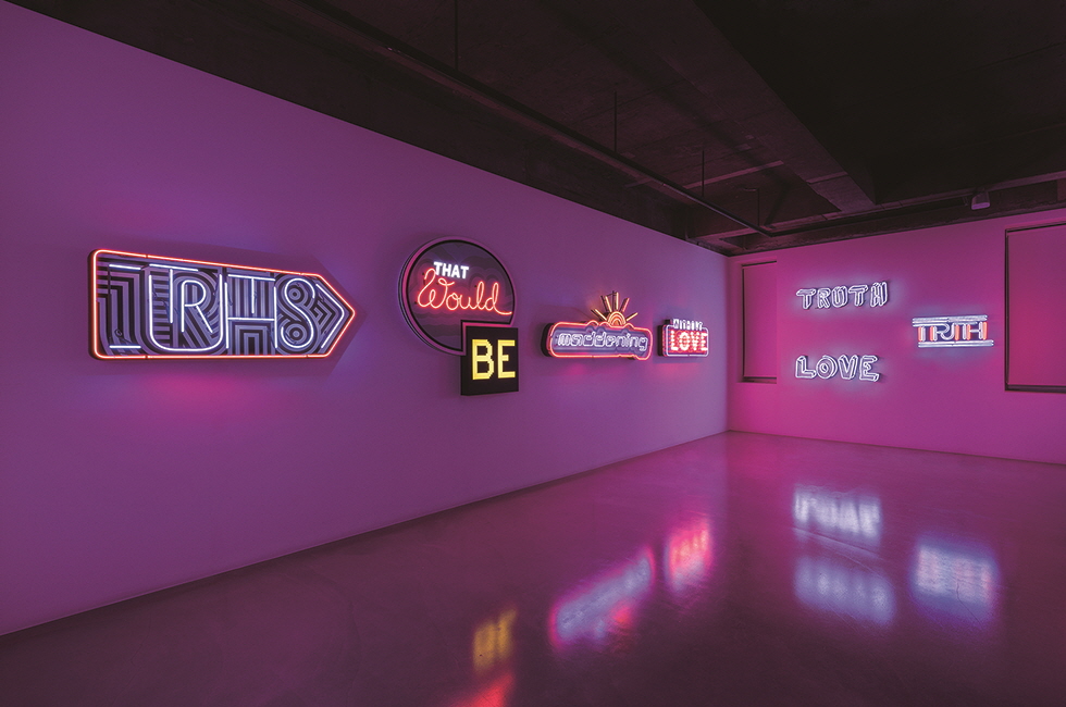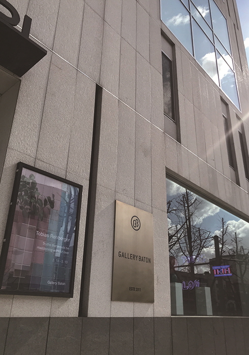 1 서울 한남동에 자리 잡은 갤러리바톤의 전시장 풍경. 토비아스 레베르거(Tobias Rehberger)의 개인전 <Truths that would be maddening without love>. 전시명과 똑같은 문구를 담은 작품이 한 벽에 나란히 설치되어 있다. 전시는 오는 5월 13일까지. 2 ‘Something else is possible in Busan’(2020), acrylic latex velvet paint on MDF, plywood, PVC Cal, 210X90X4.5cm. 3 갤러리바톤 전시 공간이 있는 건물 외관. Photo by SY Ko 4 ‘I am trying to listen to what I say(Me Version)’(2020). 이미지를 수놓은 벽에 연결된 문을 다섯 차례 열고 들어가면 맨 마지막에 나오는 공간에 설치돼 있다.