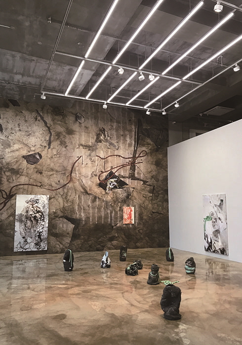 5 독일 베를린을 주 무대로 활약하는 듀오 펠레스 엠파이어(Peles Empire)의 전시 <여기에도, 나는 있다 Even here, I exist> 전시장. 서울 삼청동에 위치한 바라캇 컨템포러리의 전시 공간은 높은 층고가 인상적이다. 6 ‘셀라돈 5’(2020), 제스모나이트 위에 페인팅과 인쇄, 216X203X4cm. Courtesy of Barakat Contemporary 7 펠레스 엠파이어의 한국 첫 개인전인 이번 전시는 4월 26일까지 계속될 예정이다. 8 바라캇 컨템포러리의 2층 전시장 풍경. 바닥에 깔린 ‘인쇄된 양탄자’는 ‘TIBISCVM(E.H.I.E.) 1’이라는 작품이다. 5, 7, 8 Photo by SY Ko ※코로나19 사태로 사전 예약제로 운영한다. 9 서울 종로구 수송동에 자리한 OCI미술관에서는 독일과 한국을 오가면서 활동하는 중견 작가 샌정의 개인전 <VERY ART>가 열리고 있다. 무료입장, 오는 5월 16일까지. Photo by Photo Lee Manhong, Courtesy of the artist and OCI Museum 10 OCI미술관 외관. Photo by SY Ko 11 ‘untitled’(2019), oil on canvas, 54X40cm. Courtesy of the artist and OCI Museum 12 회화의 본질을 파고들어온 샌정의 이번 개인전은 미술관 1, 2, 3층에 걸쳐 펼쳐지고 있다.