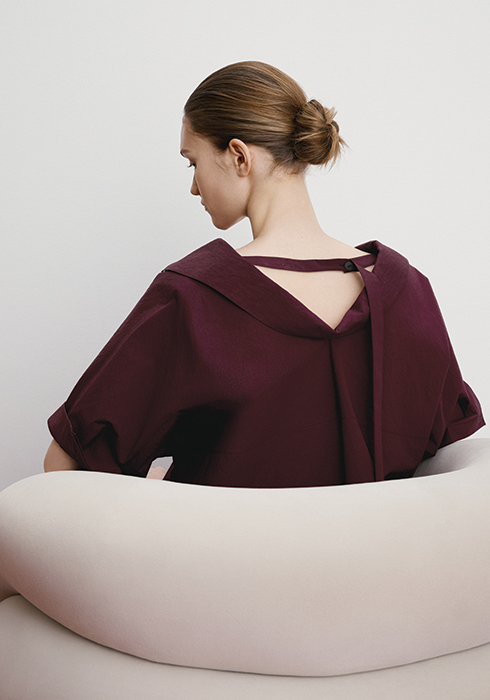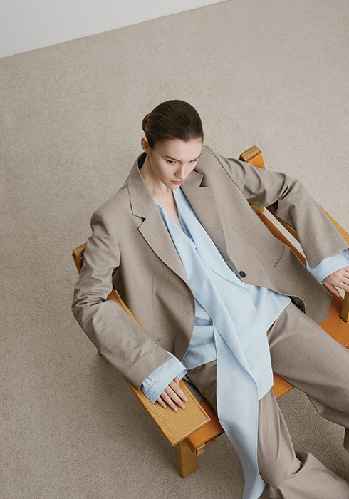 울 소재 오버사이즈 재킷 74만5천원, 타이 스트랩 언밸런스 톱 47만5천원, 울 소재 밴딩 와이드 팬츠 44만5천원.