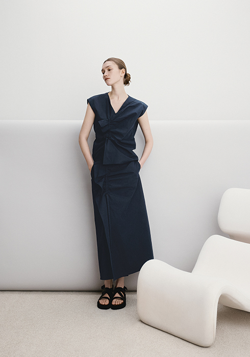 크링클 디테일의 드로스트링 톱 37만5천원, 드로스트링 패널 스커트 42만5천원.