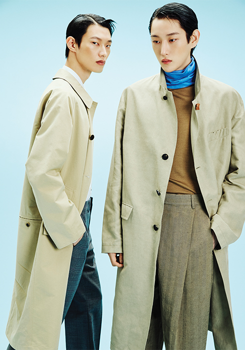 (오른쪽) 리넨 블렌드 더스터 코트 3백29만원, 실크 터틀넥 가격 미정, 릴랙스 테일러드 팬츠 1백25만원 모두 페라가모.