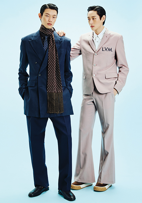 (오른쪽) 임브로이더드 시그너처 싱글브레스트 재킷 5백12만원, 롱 슬리브드 시그너처 셔츠 1백95만원, 울 부트레그 팬츠 1백95만원, LV 틸티드 스니커즈 1백77만원 모두 루이 비통.