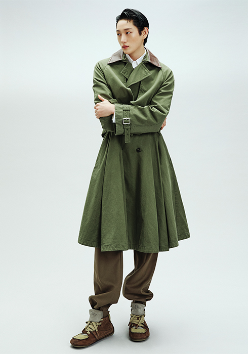 올리브 컬러 맨 트렌치코트 가격 미정, 북 커버 자수 맨 셔츠 2백30만원, 디올 자수 카고 맨 팬츠 2백30만원, 로디 레이스업 맨 부츠 1백60만원 모두 디올.