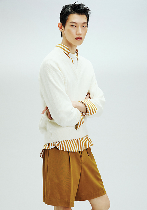 V넥 코튼 니트 톱 1백29만원, 스트라이프 포플린 폴로셔츠 89만원, 코튼 이너 톱 가격 미정, 버진 울 쇼츠 1백19만원 모두 토즈.