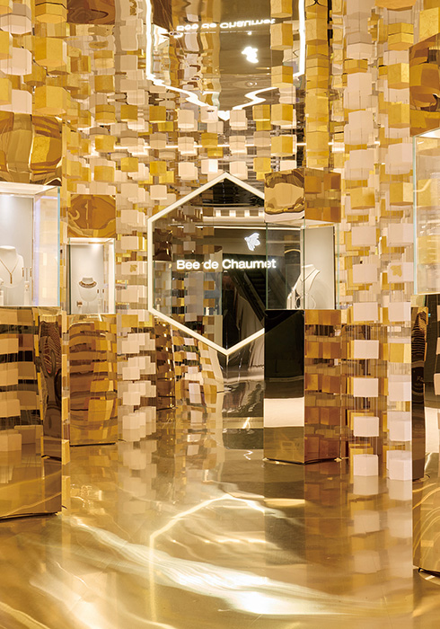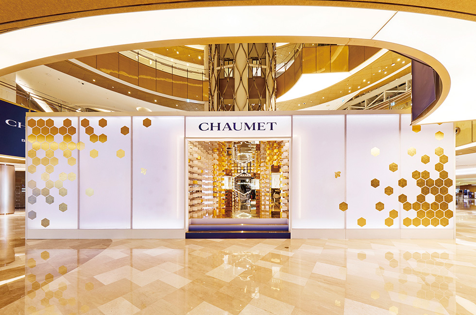 1 롯데월드타워에서 진행된 비 드 쇼메 팝업 스토어. 한지에서 영감받아 만든 허니콤 모티브로 공간을 채우고 다양한 하이 주얼리를 전시했다.