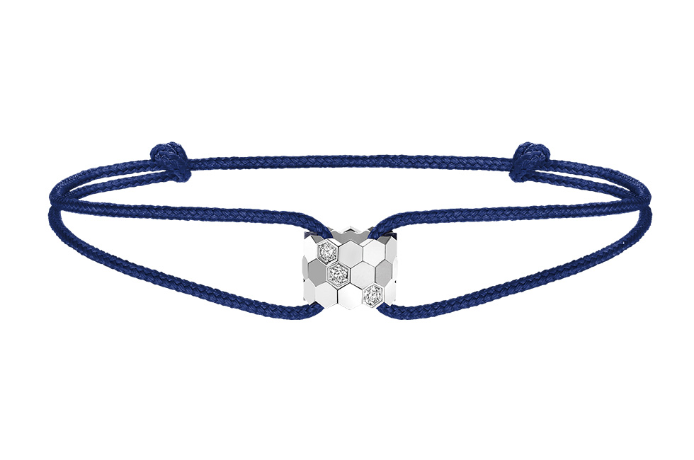 2 이번 팝업을 위해 한국에서 최초로 선보이는 비 드 쇼메 브레이슬릿. 화이트 골드 소재에 파베 및 브릴리언트 컷 다이아몬드가 세팅된 링에 블루 코드 브레이슬릿을 매치해 완성했다.
