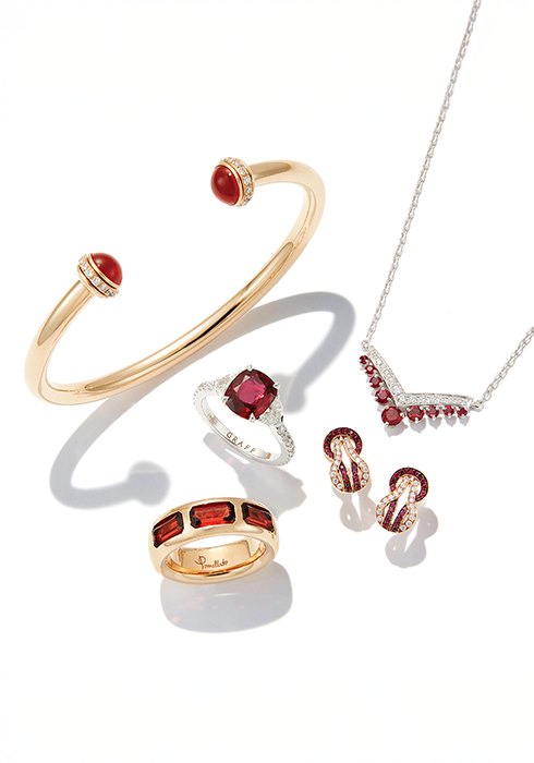 18K 로즈 골드 브레이슬릿에 강렬한 레드 컬러가 돋보이는 2.16캐럿 카보숑 컷 커닐리언 2개와 총 0.38캐럿의 브릴리언트 컷 다이아몬드 30개를 세팅해 회전하는 독특한 디자인이 특징. 가격 미정. 문의 1668-1874
