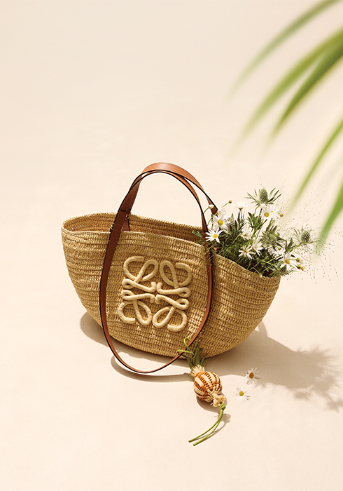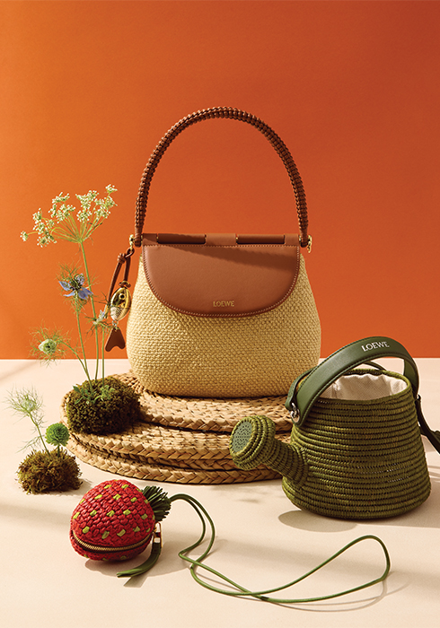 어부의 가방에서 영감받은 물고기 참이 포인트이며 나파 램 스킨 플랩과 핸들, 그리고 라피아 소재가 어우러진 페스카도르 백 23×22×8cm 4백50만원, 물조리개를 연상시키는 독특한 형태를 전통적인 카누티요 기법으로 제작한 워터링 캔 백 20×12×11cm 2백50만원, 참으로도 활용 가능한 딸기 모티브 스트로베리 코인 케이스 1백20만원 모두 로에베.